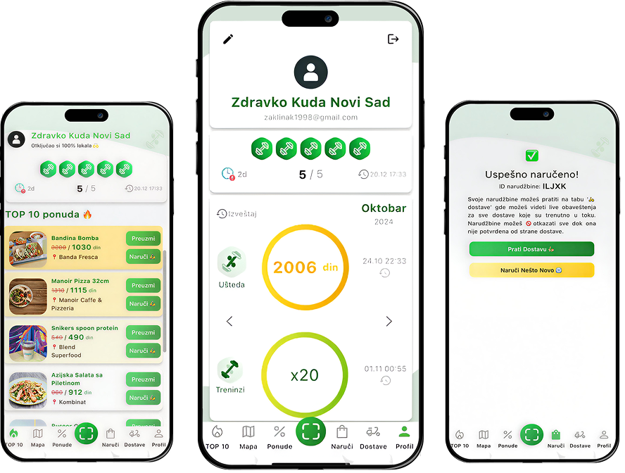 Otvaraš aplikaciju → biraš kategoriju (hrana, piće, teretana) → vidiš sve dostupne ponude u svom gradu.